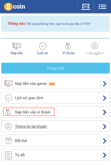 Bước 1. Chọn Nạp tiền vào tk Scoin